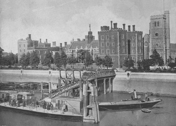 Just east of Lambeth Bridge, on the south side of the Thames, is the Palace that for six centuries and more has been the London residence of the Archbishops of Canterbury. What is commonly called the Lollards' Tower was used as a prison, and the followers of Wycliffe were not the only persons who experienced its rigours. Lovelace here found that stone walls do not a prison make. The Chapel is the oldest part of the Palace, having been built in 1245, and its windows and screen were presented by Laud. Various great ecclesiastics have added to the pile, which architecturally is of uncommon interest The Lollards' Tower is on the left in our view the Library is seen in the middle, with a lantern springing from the roof the building on the right is the parish church-St Mary's.