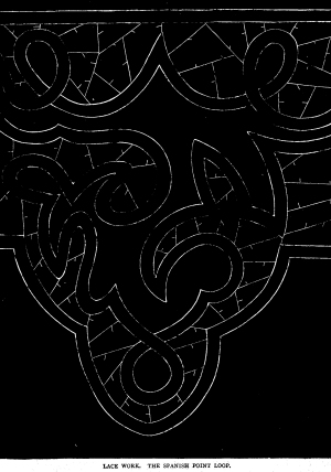 WE now give, as promised in our last article, the " Spanish Point Loop," forming a companion to the "Trefoil;" and we would advise its being used, alternately, with the trefoil, either for a banner-screen, a bracket, the border of a table-cover, or a "bordure de chemin£ e". If three of these vandykes, viz., one "loop," one "trefoil," and one "loop," or vice verse, be traced out on one length of the transparent linen, and tacked down firmly on thick twilled coloured calico, the piece of work, when completed, will be of the right length for trimming a velvet banner-screen, being laid on the velvet, along the lower edge. The two designs will be found to join perfectly, and may be continued alternately to any required length, should a table-cover, a portiere, or any other long piece of work be [-357-] required the open stitches, given in our last, may be used for the present design, and arranged after the worker's own taste.