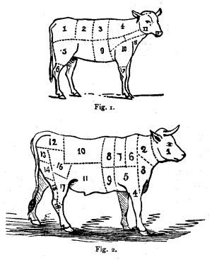 BEFORE going to market it is a very good rule to determine what shall be purchased and in what quantity. This is especially needful when the butcher is to be visited. Another rule is to deal at shops where good articles only are sold, and if possible to take your money with you, because a ready-money customer will, as a rule, be the best served. It is not always safe to let the butcher, poulterer, fishmonger, or other provision dealer choose for you; because he may be over anxious to sell what is not in the best condition, or what is for some other cause hardly saleable. Experienced persons will not fail to observe carefully the quality of what they buy, and they will reflect upon the quantity of bone, gristle, or other waste in it. They will also consider the requirements of the family, and the uses to which they can put what is not consumed as soon as cooked, At the butcher's see the meat cut and weighed, and placed ready to be sent home: you will then know what you have bought. Always buy good meat rather than inferior, and if possible, from the best parts of the animal. To aid the inexperienced, we will now enter somewhat into detail. We commence with Beef, Fig. 2; which are as follow:-