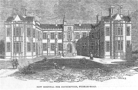 CONSUMPTION HOSPITAL, Brompton, fronting the Fulham-road, was commenced in 1844, June 11, when Prince Albert laid the first stone; the site was formerly a nursery garden, and the genial, moist air of Brompton has long been recommended for consumptive patients. The Hospital is in the Tudor style, of red brick, with stone finishings; Francis, architect; it was opened in 1846. In 1850 was attached an elegant memorial chapel (see CHAPELS, p. 213); and in 1852 was added the western wing of he Hospital, towards which Mdlle. Jenny Lind, when residing at Old Brompton, in July, 1848, munificently presented 1606l. 16s., the proceeds of a concert held by her for its aid. This noble act is gracefully commemorated by Mdlle. Lind's bust being placed upon the Hospital staircase: here also is a painted window, of characteristic design, presented by a governor. The Hospital is ventilated by machinery, worked by a steam-engine; and is warmed by water heated by two large Arnott stoves. In the kitchen, steam is used for boiling caldrons of beef-tea, mutton-broth, arrow-root, coffee, chocolate, &c.; and the provisions are wound up a shaft to the respective wards. The patients take exercise in the well-ventilated passages: and the wards are tempered by warm fresh air, which enters at the floor, and escapes by valves in the ceiling. There are a library for the in-patients, and the Rose Charity Fund for convalescents. The deaths in this new Hospital have never exceeded one in every five in-patients, whereas in the former Hospital they were one in four.
