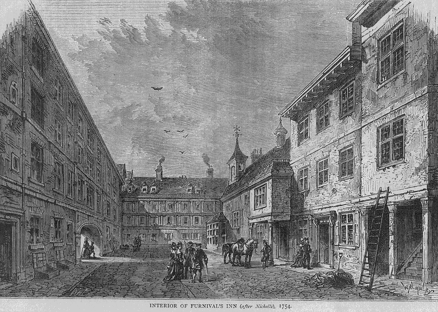 FURNIVAL'S INN, HOLBORN. Once an Inn of Chancery, attached to Lincoln's Inn, since (about 1818) a series of chambers wholly unconnected with any Inn of Court. ... The greater part of the old Inn, described by Stow, was taken down in Charles I.'s time, and a new building erected in its stead. The Gothic Hall, with its timber roof, (part of the original structure), was standing in 1818, when the whole Inn was rebuilt by Mr. Peto, the contractor.* (*Of this Hall there is an interesting view in Wilkinson's Londina Illustrata. Of the second Inn there are views in Wilkinson, and in the 1754 ed. of Stow).