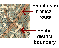 nb. at times the colour of the postal district boundary is not clear pink; this is because of reduction of number of colours used, to keep size of graphics to a minimum | |